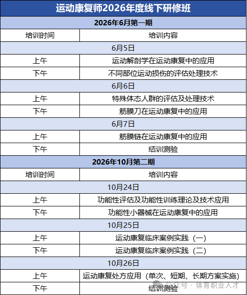 为落实国务院办公厅《关于促进全民健身和体育消费推动体育产业高质量发展的意见》中培养“运动康复师”的要求,逐步推进运动康复师新职业发展,助力专业人才实操技能的提升及行业深层服务水平的扩展,根据体育职业人才网2026年康复人才培养的要求,定于2026年6月、2026年10月举办“运动康复师线下研修班”(项目编号:TYZYRC2026-013)。现将培训事宜通知如下: